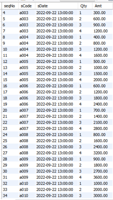 insert into sales(sCode, sDate, Qty, Amt) values (concat(k,i), '2022-09-22 13:00:00', j, (i*100) * j);