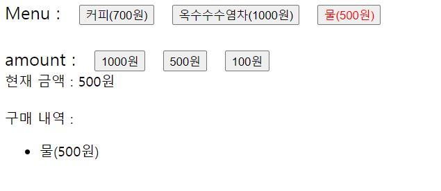 그리고 음료 버튼을 누르는 행위 = 구매 행위이다. 구매하면 투입 금액이 음료 가격만큼 차감되고, 구매 내역에 구매한 음료 이름과 금액이 아래로 추가된다.