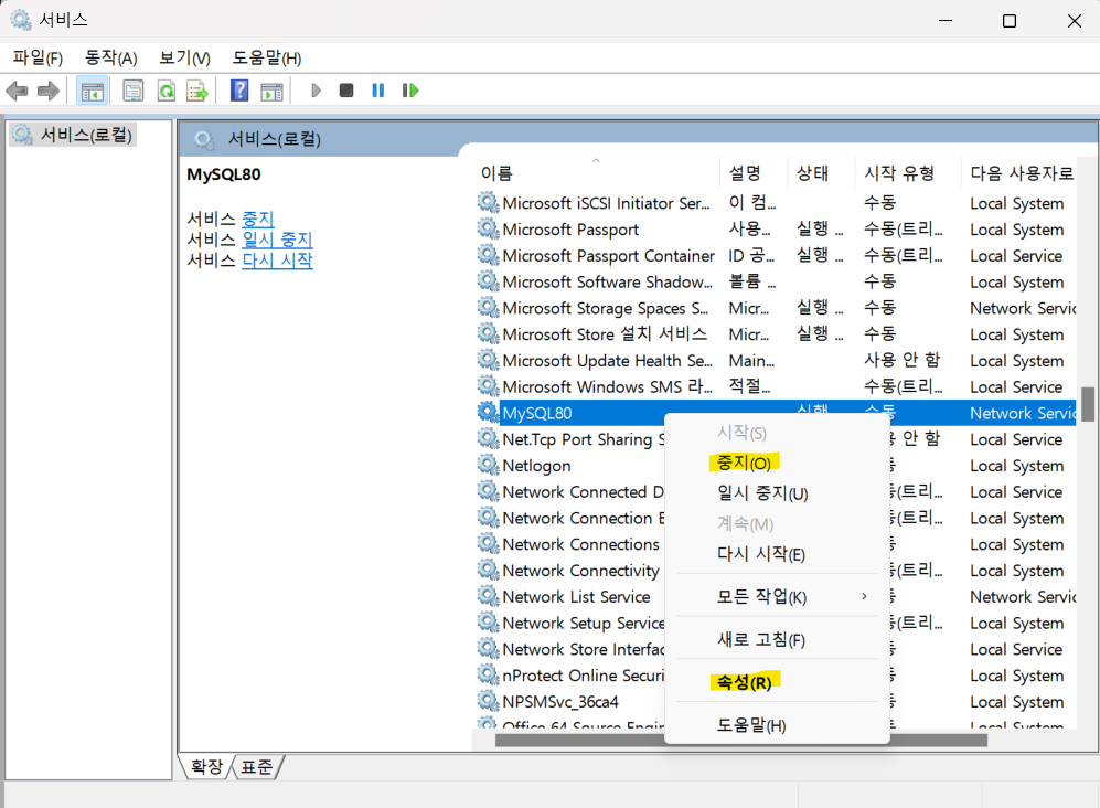 1. 서비스 - 'MySQL80' 찾아서 죽이기