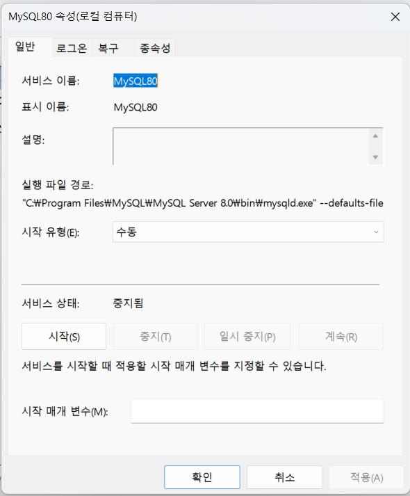 그럼 이렇게 속성창이 나오는데 여기서 실행 파일 경로를 복붙해둔다. 맨 뒤에 'MySQL80' 부분은 삭제 !! ( 'mysql installer' 로 sql 설치하신 분들은 필수 !!!)