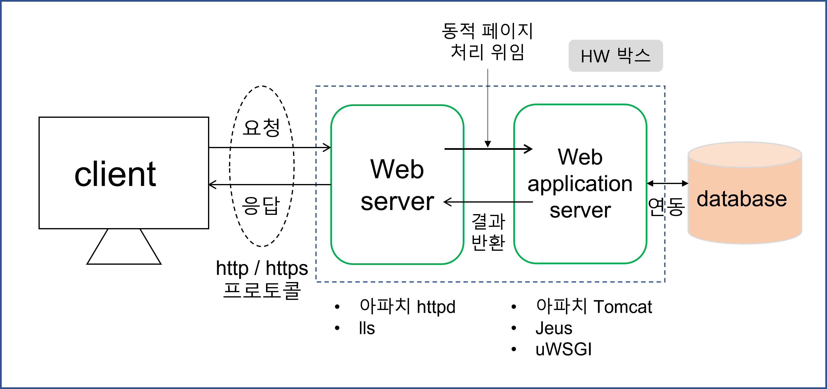 웹 클라이언트 서버의 요청을 받아서 처리하고 처리 결과를 다시 웹 클라이언트에 응답하는 서버를 통칭하여 웹 서버라고 한다. 주로 정적 페이지인 HTML, CSS, 이미지, 자바스크립트 파일을 웹 클라이언트에 제공해야 할 때 웹 서버를 사용한다. 그리고 동적 페이지 요청이 들어오면 처리를 웹 애플리케이션 서버에 위임한다.